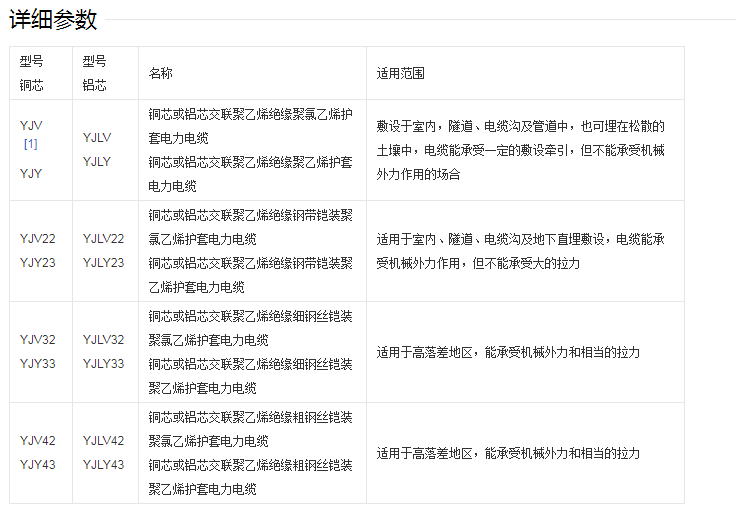 例如:YJV22-1-4*16代表聚乙烯绝缘聚氯乙烯护套的电缆,22代表垲装(即在四条线的外面有一层铁皮包裹),一共4芯,截面积为16平方毫米。