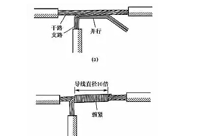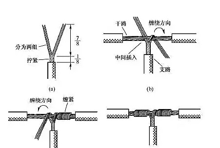 另一种方法如图3所示,将支路芯线靠近绝缘层的约1/8芯线绞合拧紧,其余7/8芯线分为两组[见图3a)],一组**干路芯线当中,另一组放在干路芯线前面,并朝右边按图3(b)所示方向缠绕 4~5圈再将**干路芯线当中的那一组朝左边按图3(c)所示方向缠绕4~5圈,连接好的导线如图3(d)所示。