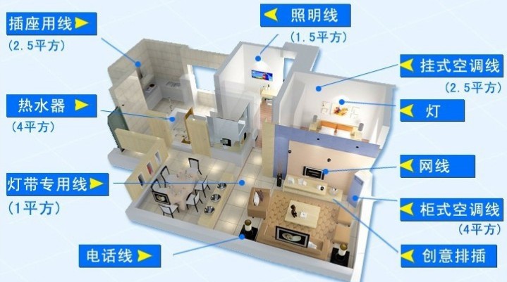 有人说用1.5、2.5、4、6,甚至有人说用10的。根据本人多年的电工实际经验来看,是这样的:主线从开关出来,分四路。两路为插座和厨房;另外两路是照明电。主线分别是4,照明分别是1.5.这样是比较好的。万一那一路坏了,另一路还可以工作,起码可以用一个插排作为应急使用。