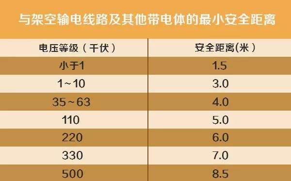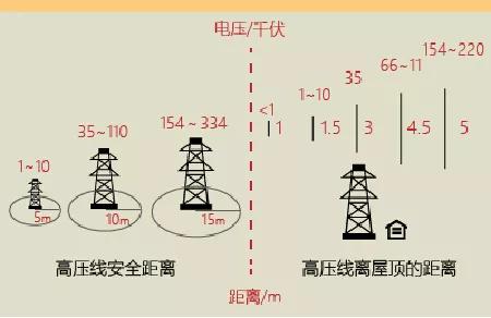 不同电压等级的高压带电线路所必须保持的安全距离,当物体进入这些安全距离时,就会引起放电。根据《电力设施保护条例实施细则》对安全距离的规定,1千伏以下高压线的安全距离为4米;1-10千伏高压线的安全距离为5米;35-110千伏高压线的安全距离为10米;154-220千伏高压线的安全距离为15米。
