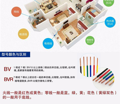 为了防火、维修和安全,所以你在选择家装电线规格宜选用带标志的“国标”铜芯电线,线材槽载的面积一般是:家装电线规格照明用线选用的是1.5平方毫米,而插座用线选用2.5平方毫米,注意空调用线不得小于2.5平方毫米,家里接负线(零线/地线)宜选用绿黄双色线,而接开关线(火线)则用红、黄等任一种。我们在同一家装工程中用线的颜色和用途要保持一致。