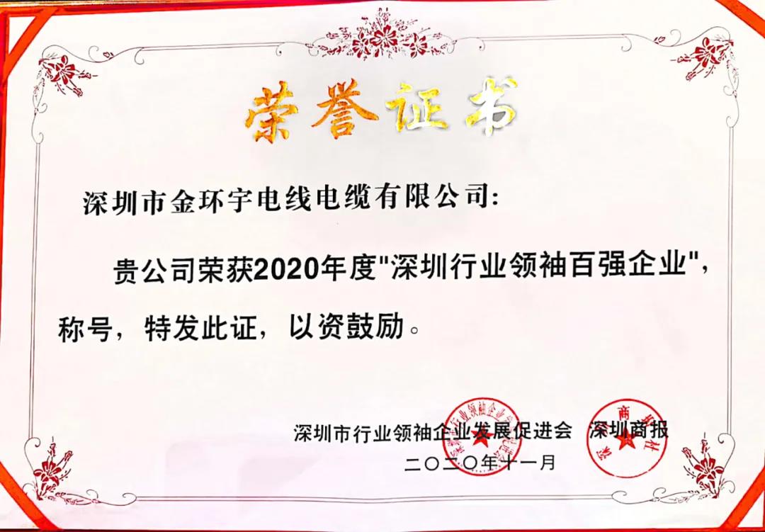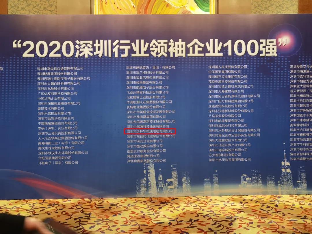 深圳市金环宇电线电缆有限公司本次很荣幸入选“2020深圳行业领袖企业100强”。