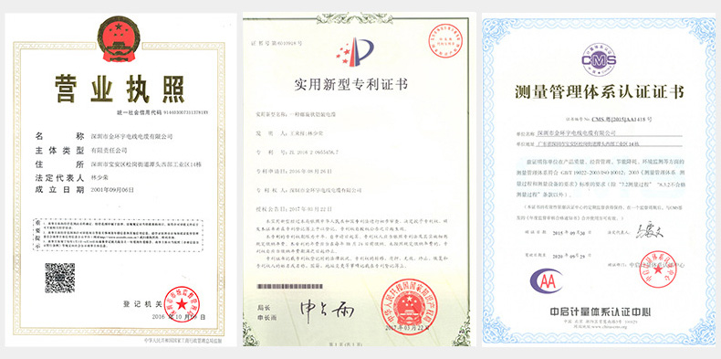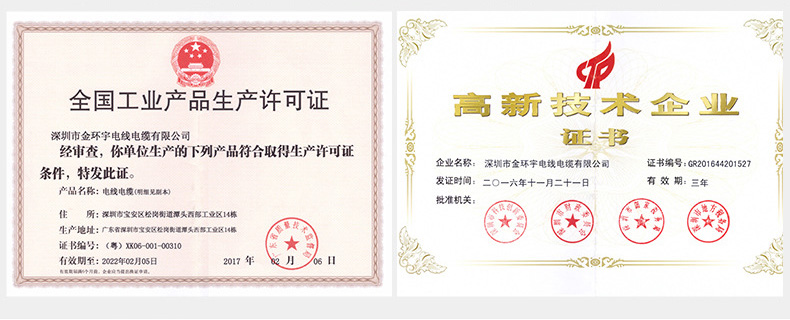 金环宇电线电缆自建厂年来,产品严格按照国际标准生产,坚持以质量求生存,以质量求发展,以质量求信誉,坚信品质造就名牌,真诚创造未来,且荣获国家质监局生产许可证、国家质检中心质量合格证、国家认证委员会“3C”强制认证及广东省质监局质管体系认证和广东省消防认证;通过ISO9001-2000质量管理体系认证,连年被评为省、市级“深圳市产品监督检验质量好企业”荣誉称号,并荣获国家免检、广东省名牌产品称号,质量由中国人民保险公司承担责任保险。