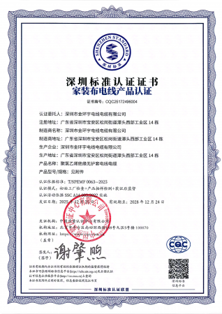 “深圳标准认证”是产品质量检测的官方名片,也为消费者提供品牌质量可信任的鉴定符号。未来,金环宇电缆将继续以高标准为指引,积极吸纳前沿技术及创新理念,为用户提供高品质产品,为行业树立质量标杆,助力行业高质量发展。