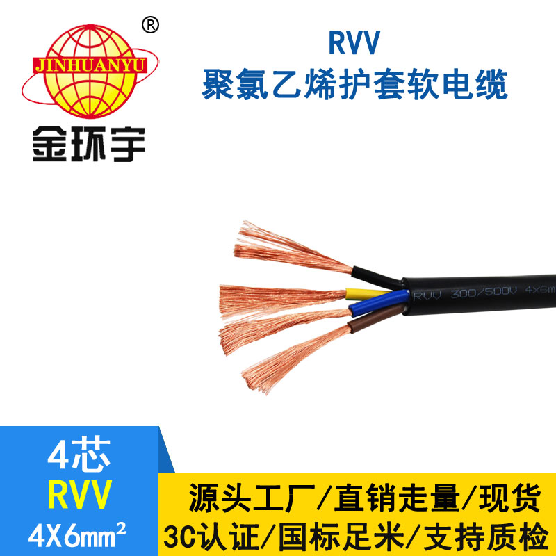 金环宇RVV4*6平方电缆有普通型、阻燃、耐火三种特性。阻燃—ZR 阻燃A类,阻燃B类,阻燃C类。耐火—NH 阻燃A类耐火,阻燃B类耐火,阻燃C类耐火。